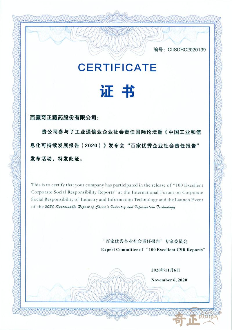 2020年6月“百家優(yōu)秀企業(yè)社會責任報告”-證書