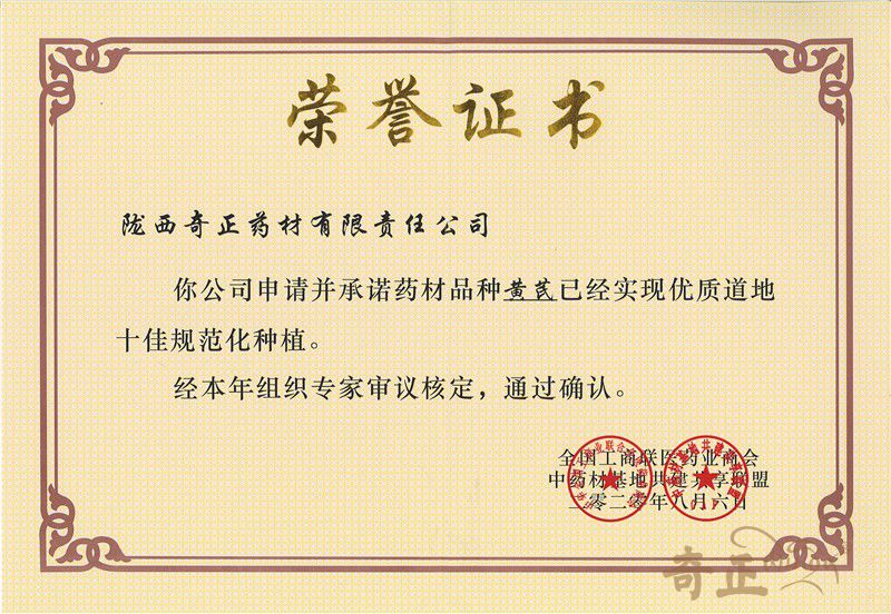 黃芪十佳規(guī)范化種植證書