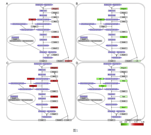 有趣的是,在海馬體和運動皮層中,與對照組健康大鼠相比,在安慰劑組CP大鼠中,各種膽固醇代謝途徑的催化酶的表達上調,與安慰劑組CP大鼠(圖1)相比,白脈軟膏組各種膽固醇代謝途徑的催化酶的表達下調。同時,膽固醇合成途徑中的Hmgcs1、Idi1和sql催化酶也發(fā)生了類似的改變。運動皮質中只有Mvd、Fdps和Dhcr7發(fā)生改變,而海馬中沒有。與安慰劑組CP大鼠相比,白脈軟膏組CP大鼠Rps6ka1表達明顯降低。同樣,第40S核糖核糖核糖蛋白RPS8、RPS9、RPS25和RPS27的表達也受到了控制。