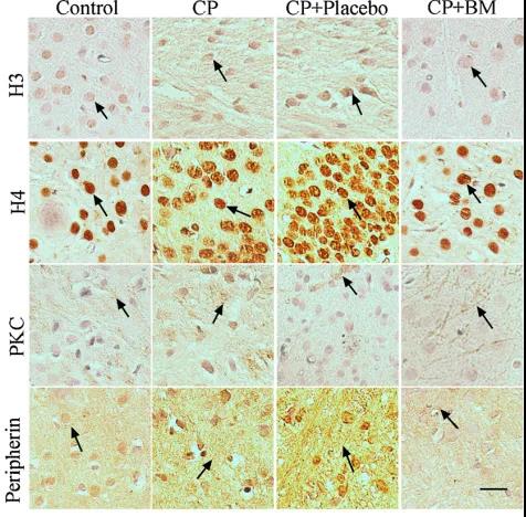 使用免疫組化法定位大鼠海馬中CP相關蛋白的表達(圖2),與對照組相比,在安慰劑CP大鼠中,組蛋白3.3和組蛋白4的表達被下調。然而,與對照組和安慰劑組相比,白脈組CP大鼠組蛋白3.3和組蛋白4表達上調。與對照組相比,模型組CP大鼠和安慰劑組CP大鼠的PKC-δ和外周蛋白表達上調;然而,與對照組和安慰劑組相比白脈治療組CP大鼠的PKC-δ和周圍蛋白表達下調。