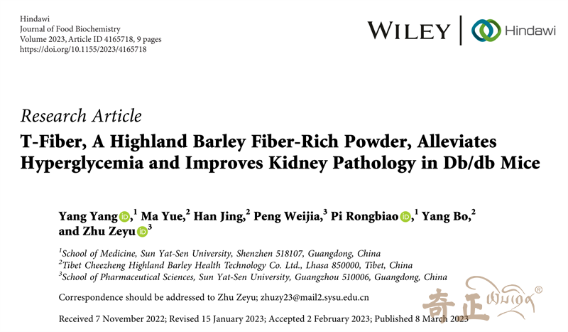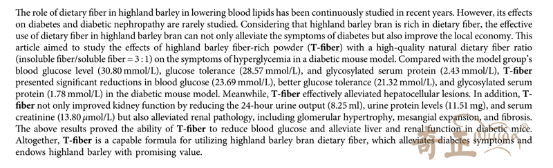 第二篇論文題目為《T-Fiber, A Highland Barley Fiber-Rich Powder, Alleviates Hyperglycemia and Improves Kidney Pathology in Db/db MiceT-Fiber》(T-FIBER青稞高纖粉,緩解糖尿病模型Db/db小鼠的高血糖癥狀并改善腎臟病理),與中山大學(xué)合作發(fā)表在《Journal of Food Biochemistry》,2022年度影響因子3.654。