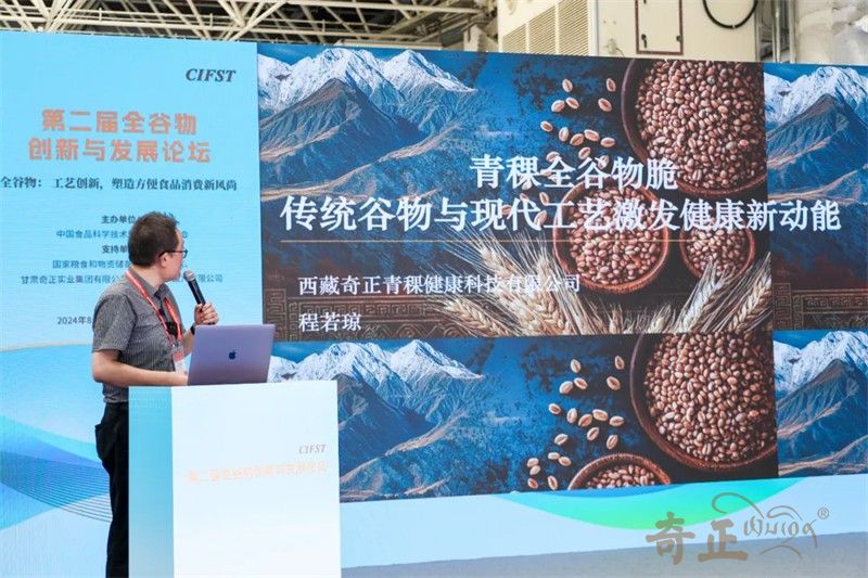 甘肅奇正實業(yè)集團有限公司總經理、西藏奇正青稞健康科技有限公司董事長程若瓊先生在大會發(fā)表講話,圍繞“青稞全谷物脆:傳統谷物與現代工藝激發(fā)健康新動能?”提出:青稞是全谷物家族的新勢力。