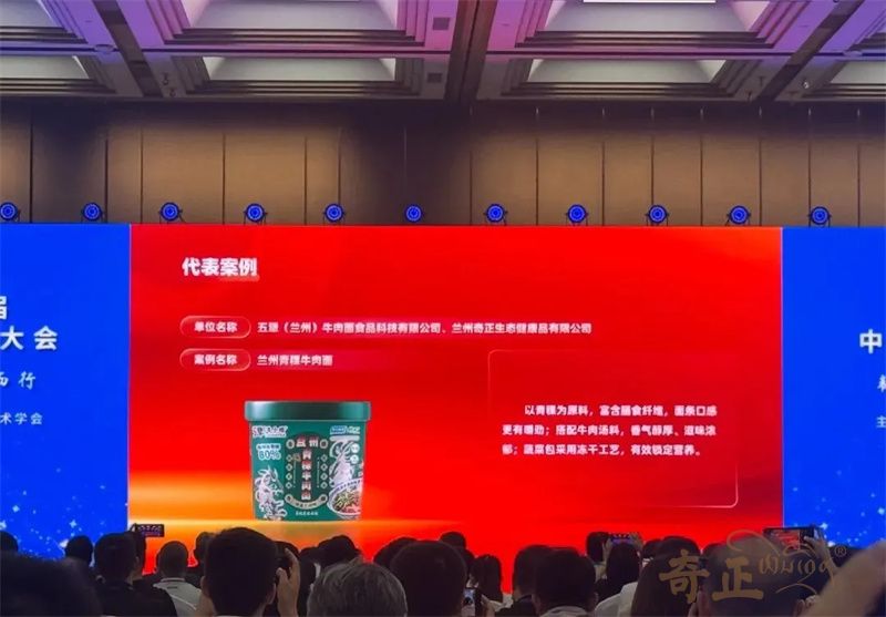 在大會代表案例展示中,由奇正生態(tài)健康品有限公司生產(chǎn)的蘭州青稞牛肉面榮登“2024—2025年度中國方便食品行業(yè)科技與產(chǎn)業(yè)創(chuàng)新新趨勢代表案例”,該產(chǎn)品以青稞為原料,富含膳食纖維,面條口感更有嚼勁;搭配牛肉湯料,香氣醇厚、滋味濃郁;蔬菜包采用凍干工藝,有效鎖定營養(yǎng)。和傳統(tǒng)牛肉面相比,青稞牛肉面中青稞含量高達80%,膳食纖維和β- 葡聚糖含量更高,且青稞面餅非油炸,相對更健康。