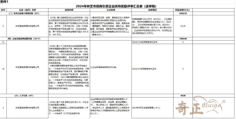 根據(jù)《林芝市推進(jìn)改革開(kāi)放促進(jìn)招商引資試行辦法》(林政發(fā)[2022]69號(hào))相關(guān)規(guī)定,經(jīng)林芝市招商引資企業(yè)扶持獎(jiǎng)勵(lì)資金評(píng)審小組及林芝市發(fā)展和改革委員會(huì)黨組研究同意,林芝雪域資源科技有限公司共獲批2024年度招商引資企業(yè)扶持獎(jiǎng)勵(lì)資金45.29萬(wàn)元,其中包括:一是根據(jù)公司2023-2024年期間銷售額、工業(yè)增加值、區(qū)內(nèi)采購(gòu)指數(shù)、帶動(dòng)就業(yè)以及研發(fā)投入強(qiáng)度等情況,給予一定企業(yè)成長(zhǎng)扶持獎(jiǎng)勵(lì)資金,用于支持研發(fā)創(chuàng)新和擴(kuò)大再生產(chǎn)的企業(yè)做大做強(qiáng)獎(jiǎng)勵(lì)25.29萬(wàn),二是對(duì)公司引進(jìn)的博士學(xué)歷且全職服務(wù) 2 年及以上的高層次人才,一次性給予的安家補(bǔ)貼10萬(wàn)元,三是對(duì)公司2023-2024年期間新申報(bào)的發(fā)明專利給予一次性扶持獎(jiǎng)勵(lì)資金10萬(wàn)元。
